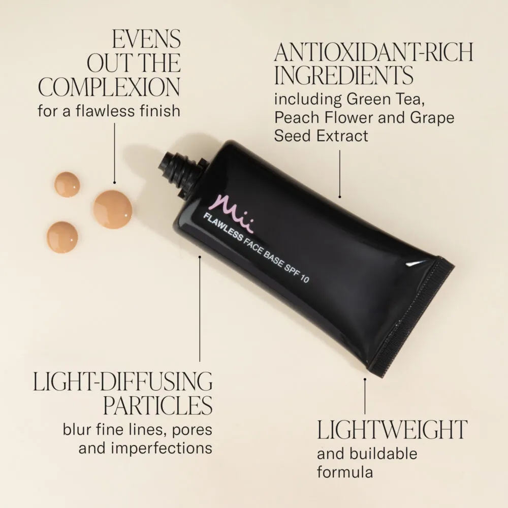 Mii Flawless Face Base Foundation Perfectly Honey is a liquid foundation created for medium beige skin tones with neutral undertones, offering a smooth, balanced finish that looks natural and refined. This well loved formula applies effortlessly, helping your complexion appear even and softly radiant without looking heavy or overworked. Designed to feel like a second skin, it blends seamlessly and allows you to build coverage gradually, making it suitable for both everyday wear and more polished occasions. The texture is lightweight and silky, spreading evenly across the skin while helping to soften the visible look of fine lines and minor imperfections. Light diffusing particles create a gentle blurring effect, giving the complexion a fresh, camera ready appearance while still looking realistic and comfortable. Perfectly Honey adapts well to your natural skin tone, delivering a flattering finish that remains comfortable from morning through to evening. Suitable for: Medium beige skin tones with neutral undertones seeking a natural looking foundation with buildable coverage. Benefits: